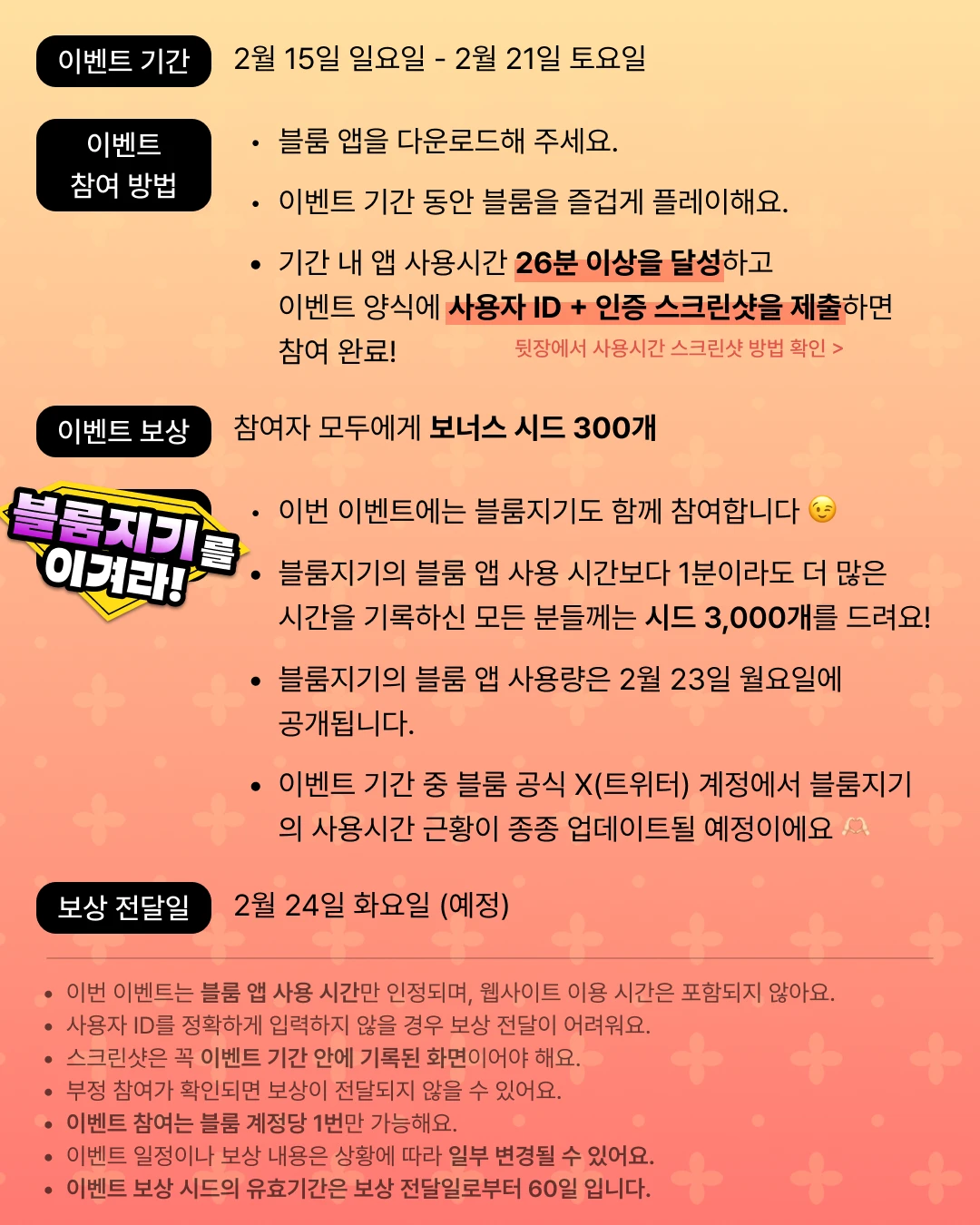๊ธฐ๊ฐ ๋ด ๋ธ๋ฃธ ์ฑ ์ฌ์ฉ์๊ฐ์ด 26๋ถ ์ด์์ ๋ฌ์ฑํ๊ณ ์ฌ์ฉ์ ID์ ํจ๊ป ์ฌ์ฉ์๊ฐ ์ธ์ฆ ์คํฌ๋ฆฐ์ท์ ์ด๋ฒคํธ ์์์ ์ ์ถํ๋ฉด ์ฐธ์ฌ ์๋ฃ!